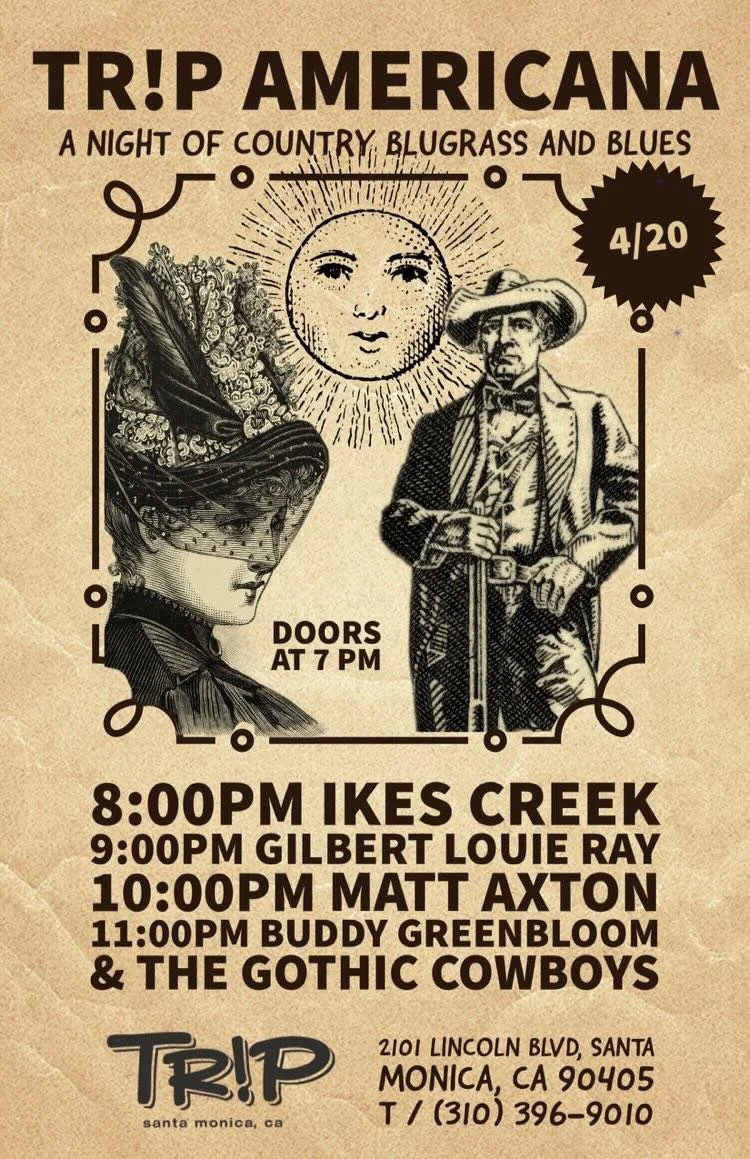 Americana at Trip! Thursday, April 20, 2023 7:00 PM 11:55 PM Google Calendar ICS Americana night at Trip boasts the likes of Matt Axton, Gilbert Louie Ray, Ikes Creek as well as Buddy Greenbloom. It’s a free show, sure to leave you feeling good!