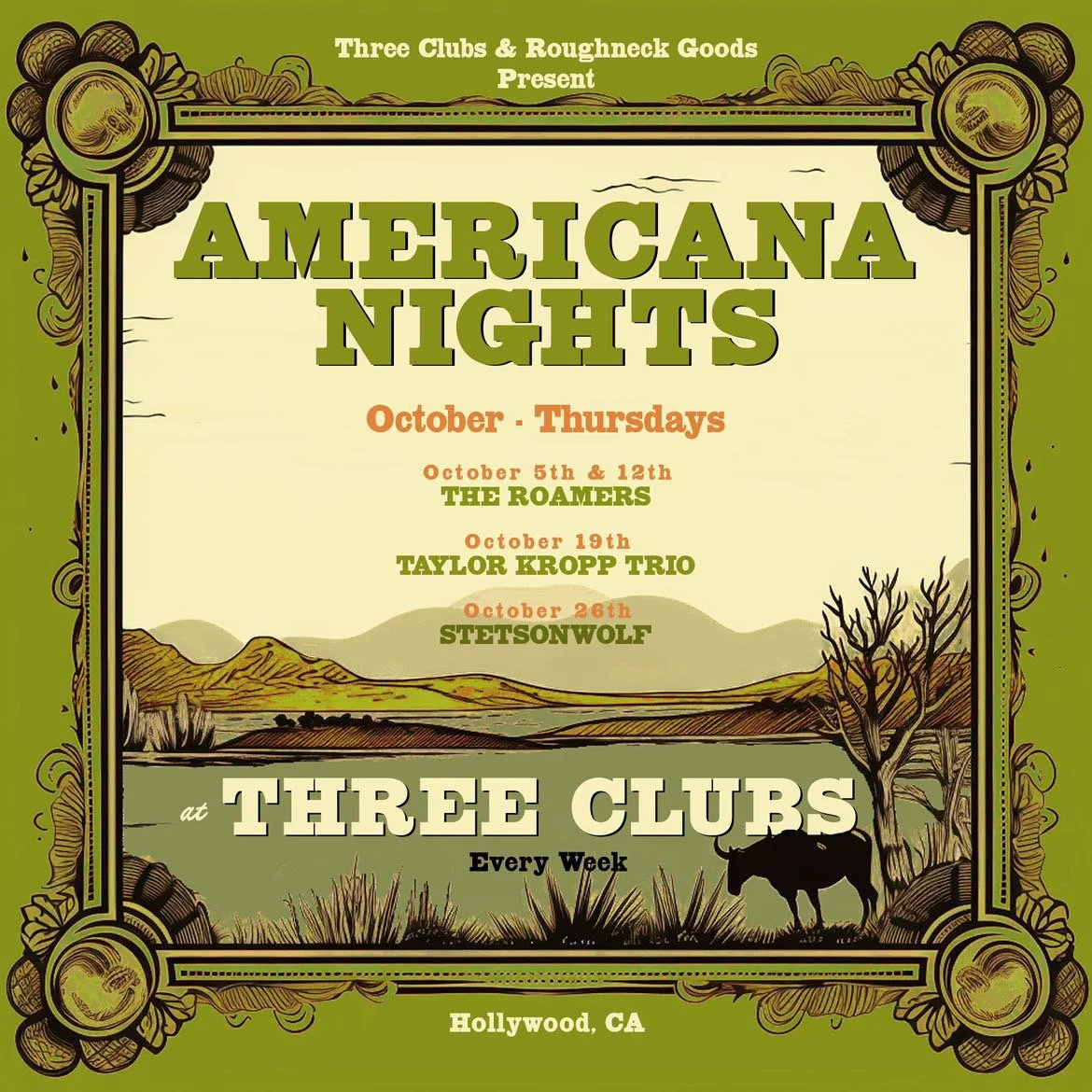 Back to All Events Americana Night @ Three Clubs Thursday, October 12, 2023 9:00 PM 11:55 PM Three Clubs 1123 Vine Street Los Angeles, CA, 90038 United States (map) Google Calendar ICS Head to Three Clubs in Hollywood for a free Americana show every Thursday night! There will be a new band hosting for each evening, and you never know who will pop in as a special guest.This weeks host is Rice & the Roamers.Starts at 9, Free Show!