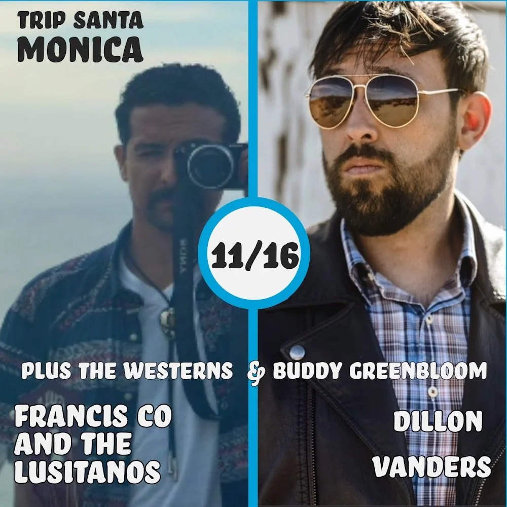 Americana Night @ Trip! Thursday, November 16, 2023 7:30 PM 11:55 PM Trip 2101 Lincoln Boulevard Los Angeles, CA, 90291 United States (map) Google Calendar ICS Buddy Greenbloom’s Americana night at Trip is back! This time, it’s a Wild Turkey Thanksgiving celebration and all y’all are invited to break bread and drink beer while enjoying a free show with some of SoCal’s best Americana musicians! 8:00 PM Francis Co. and the Lusitanos8:45 PM Dillon Vanders 9:30 PM The Westerns10:00 PM Buddy Greenbloom Don’t be a turkey, head over to Trip!Follow Buddy on Instagram HERE