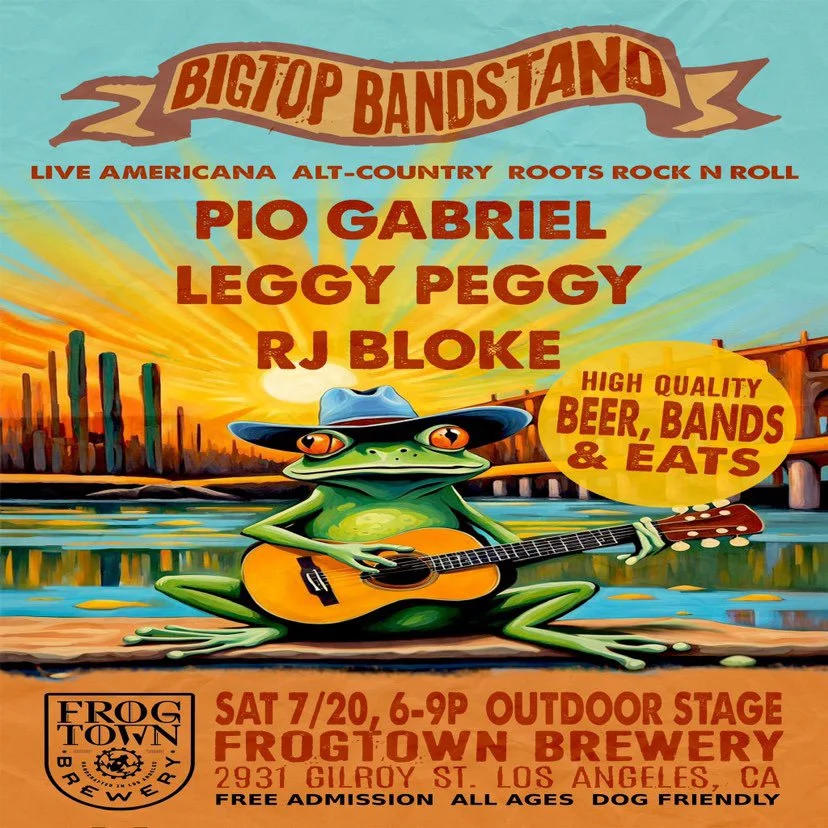 BigTop Bandstand Saturday, July 20, 2024 6:00 PM 9:00 PM Frogtown Brewery 2931 Gilroy Street Los Angeles, CA, 90039 United States (map) Google Calendar ICS Fresh off of his debut at the Dodger’s game on July 4th, catch Pio Gabriel live at Frogtown Brewery. He’ll be joined on the bill by Leggy Peggy and your host Patrolled By Radar for a free afternoon of music you don’t want to miss.Free admission, starts at 6pm!Follow Bigtop Bandstand on Instagram HERE