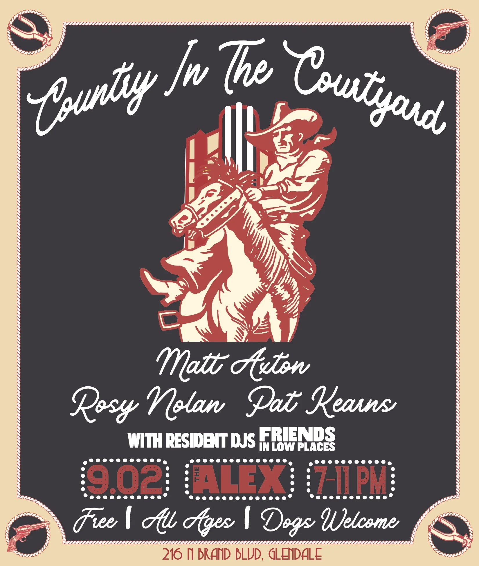 Friends In Low Places and the Alex present Country in the Courtyard, a weekly country showcase with some of LA’s best country and Americana artists in the courtyard of the Alex Theatre in Glendale!