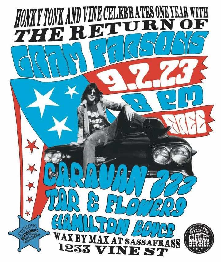 They say time flies when you’re having fun, and that must be true because the Honkytonk and Vine series at Sassafras Saloon is already a year old! Come celebrate with a very special Gram Parsons tribute night, where Hamilton Boyce, Tar & Flowers and Caravan 222 will be kicking out the groovy Gram tunes as well as some of their own cosmic country originals.