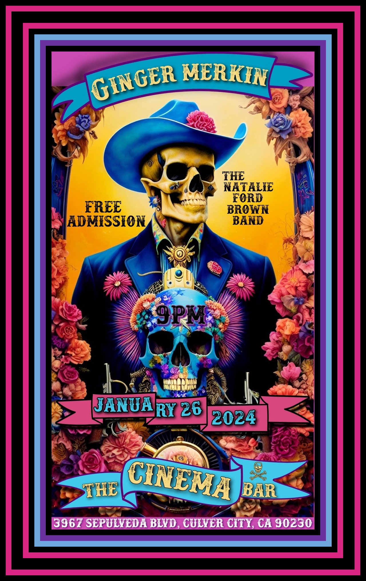 Ginger Merkin @ Cinema Bar Friday, January 26, 2024 9:00 PM 11:55 PM Cinema Bar 3967 Sepulveda Boulevard Culver City, CA, 90230 United States (map) Google Calendar ICS Ginger Merkin is taking over the Cinema Bar and it might get loud. Enjoy some cold beverages as they heat up the stage with rock and country music with friends the Natalie Ford Brown Band also in the house. It’s fun, it’s free, it’s on!Follow Ginger Merkin on Instagram HERE