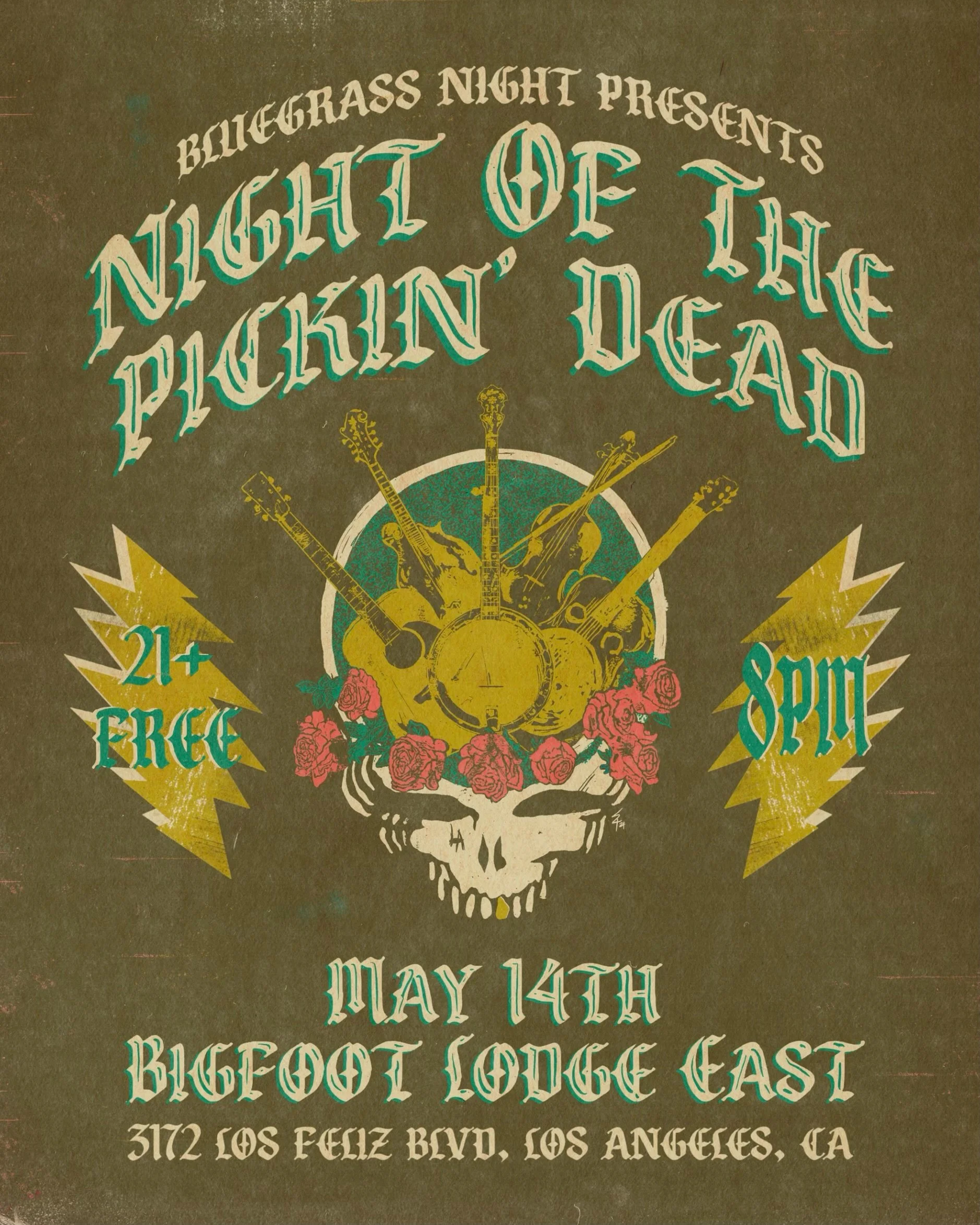 Back to All Events Night of the Pickin’ Dead Tuesday, May 14, 2024 8:00 PM 11:00 PM Bigfoot East 3172 Los Feliz Boulevard Los Angeles, CA, 90039 United States (map) Google Calendar ICS Night of the Pickin’ Dead rolls on with another evening of bluegrass music dedicated to the Grateful Dead. $10 suggested donation, and get there early because it gets packed!21+Follow Bluegrass Night on Instagram HERE