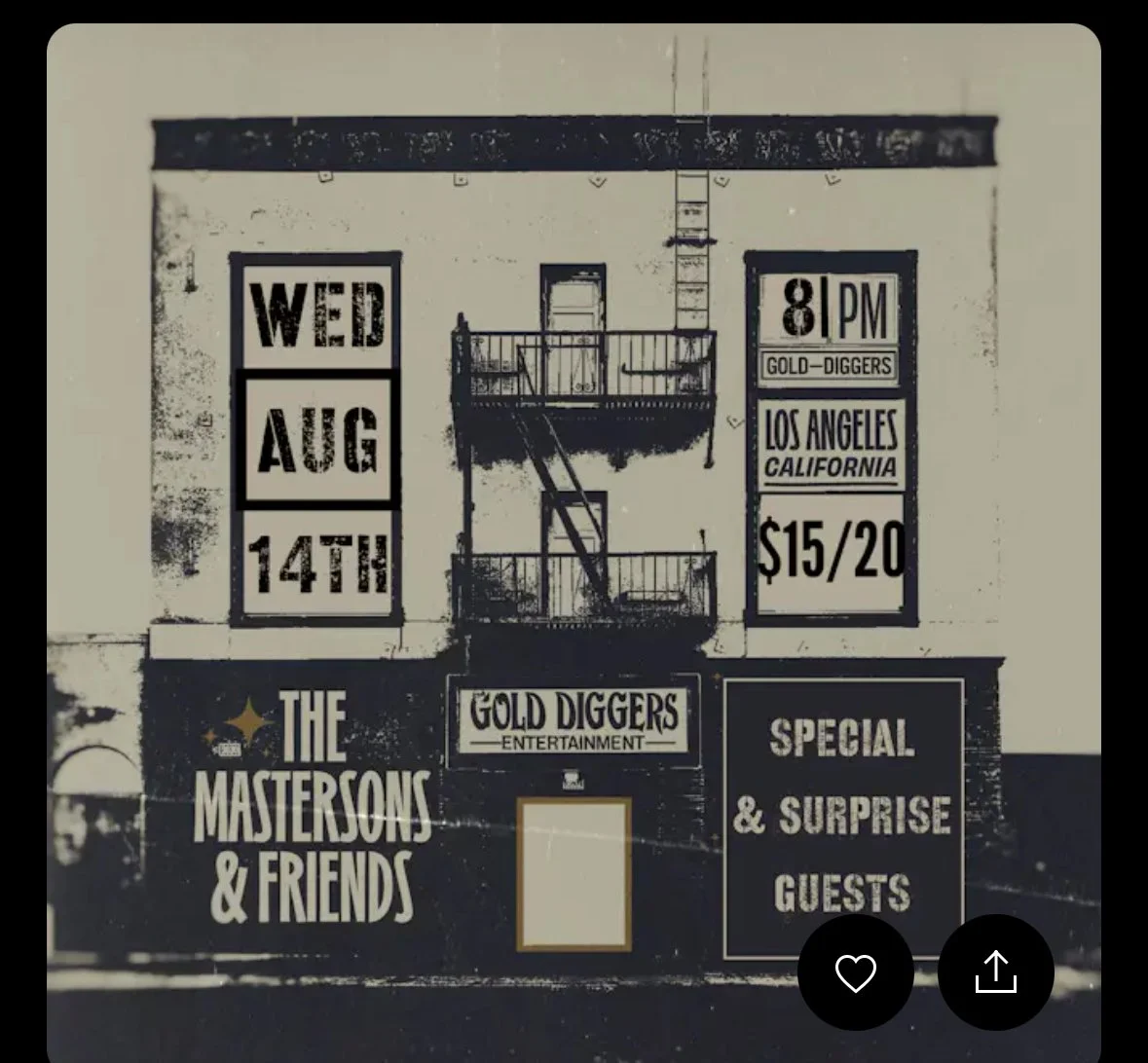 The Mastersons @ Gold Diggers Wednesday, August 14, 2024 8:00 PM 11:00 PM Gold Diggers 5632 Santa Monica Boulevard Los Angeles, CA, 90038 United States (map) Google Calendar ICS Come celebrate a night of Americana music in Hollywood at Gold Diggers with The Mastersons and Friends! Stopping by will be Brent Rademaker, Miranda Lee Richards, The Whitmore Sisters, and Manda Mosher (who will also be celebrating her birthday!).Buy Tickets HERE