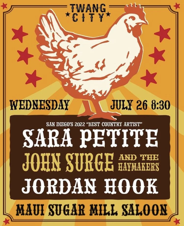 Back to All Events Twang City @ Maui Sugar Mill Wednesday, July 26, 2023 8:00 PM 11:55 PM Maui Sugar Mill 18389 Ventura Boulevard Los Angeles, CA, 91356 United States (map) Google Calendar ICS The hottest night of country music in the valley continues at the Maui Sugar Mill as Jordan Hook kicks off the night with a full band. John Surge and his Haymakers follow and Sara Petite will headline the night!Free show.
