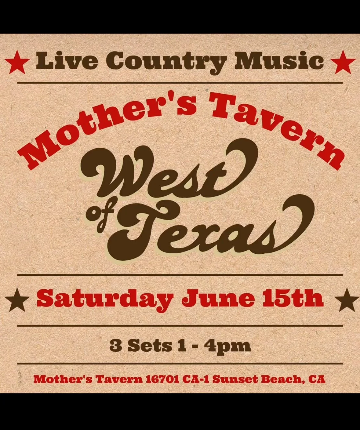 Back to All Events West of Texas @ Mother’s Tavern Saturday, June 15, 2024 1:00 PM 4:00 PM Mother's Tavern 16701 California 1 Huntington Beach, CA, 90742 United States (map) Google Calendar ICS Your favorite honky tonk band West of Texas is back in the OC to play 3 hours of country music at Mother’s Tavern! Bring your dancing shoes and kick up your feet with the best tunes in the West at this free show.
